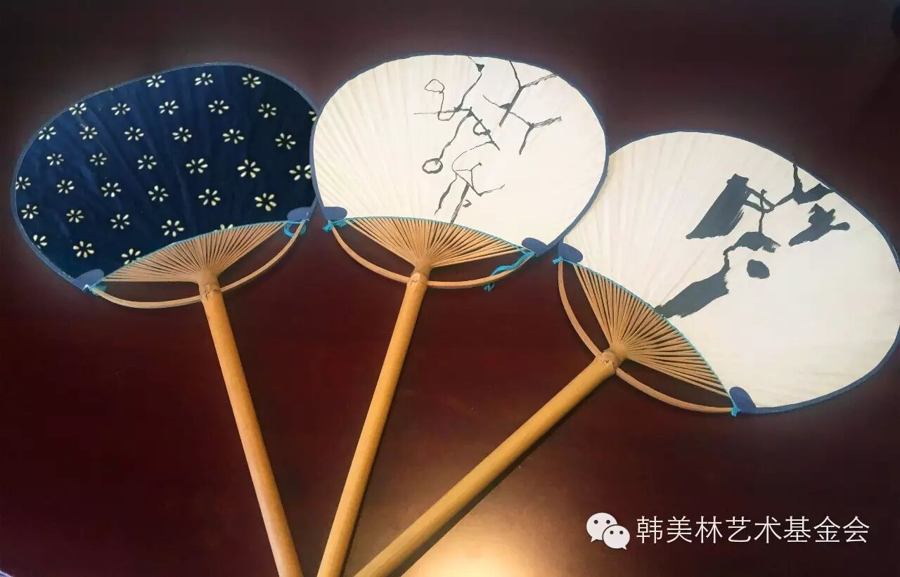 韩美林在蓝印花布团扇上绘制了“天书”