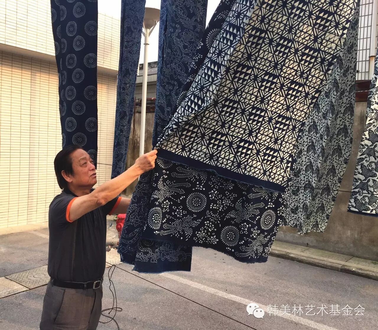 韩美林察看染完色正在晾干的蓝印花布