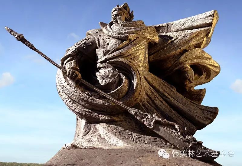 2013年5月,韩美林应湖北有关方面之邀,为正在打造的荆州关公文化园设计制作一座地标性城市雕塑。作为历史文化名城,蜀汉大将关羽曾镇守荆州,“总督荆襄九郡诸事十年有余”,留下了许多可歌可泣的英雄事迹。韩美林反复多次前往荆州考察关公文化、翻阅大量资料后,他几易其稿,最终确定了《关公》雕塑的形象设计。关公侧身右手持刀,左手携起衣角、披风飘扬,是山又是风,韩美林的设计既表现了关公气势如虹、贯穿寰宇的形象和勇气,又在衣褶、胡须等细节部位融入了现代感,使雕塑充满了迎风破浪的动感。