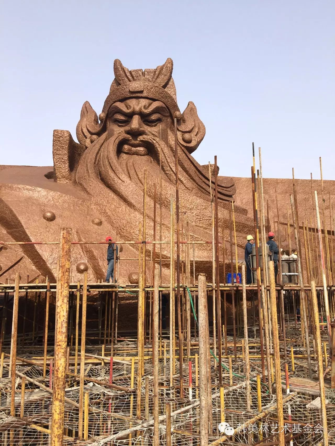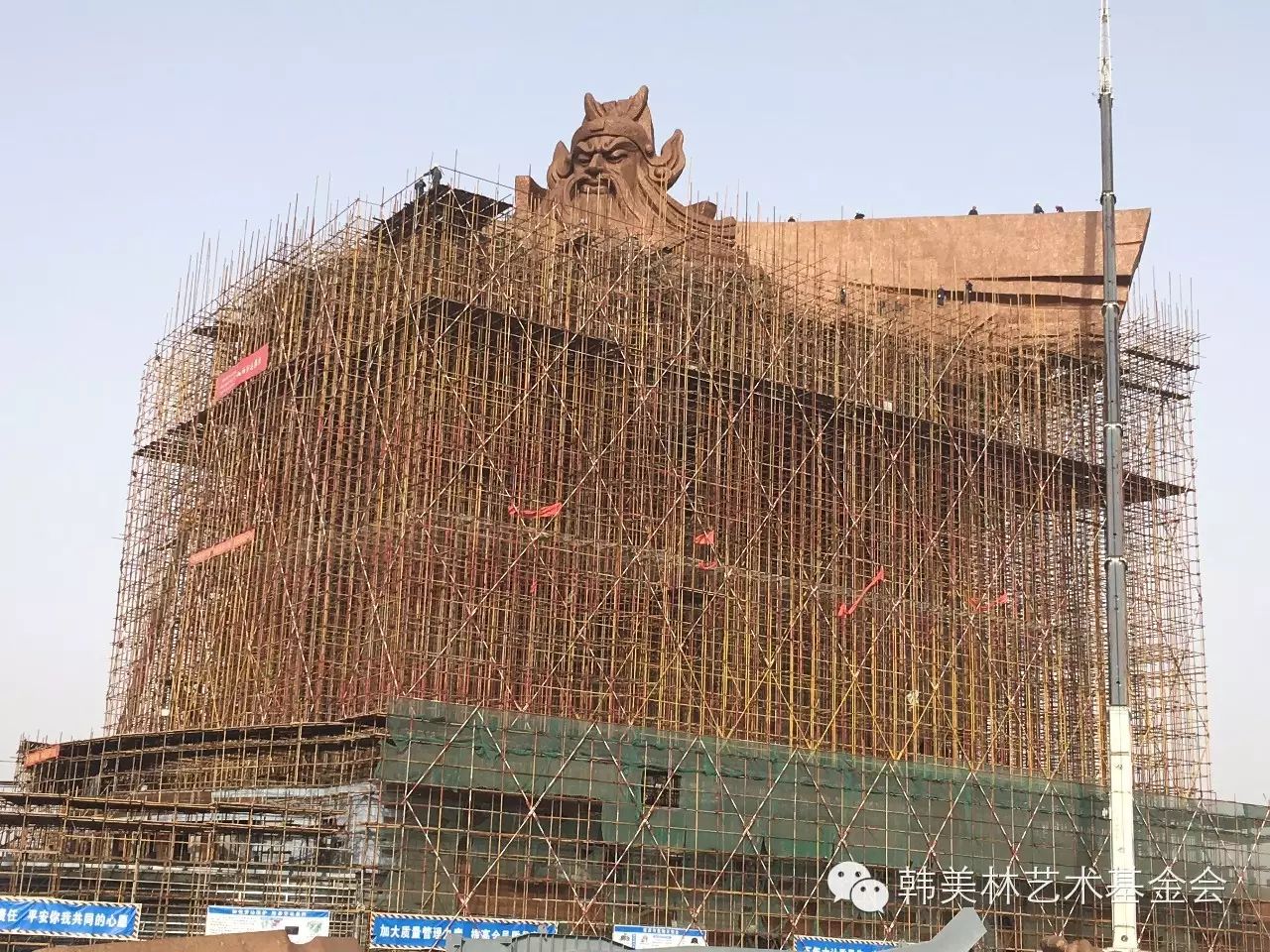 远远望去,魁梧高大的关公面向东南紧锁双眉,与身后被风吹起的战袍浑然一体,如山峦般厚重而不怒自威。雕像自颈部以下,被整齐有序的脚手架层层包裹,身体部分还难见全貌。然而仅就露出的头部和硕大的体量就足以令人震撼:正在雕塑肩上忙碌的工人,远远看去,他们头顶的安全帽变成了一个个依稀可见的小红点;雕塑脚下,10米高的基座让人不得不抬头仰望;雕塑基座下,还未安装的青龙偃月刀的刀柄直径有圆桌般粗细,长达数十米,据说,这个刀柄刚刚运过来的时候,曾被当地群众误认为是个导弹的模型,其体量可见一斑。