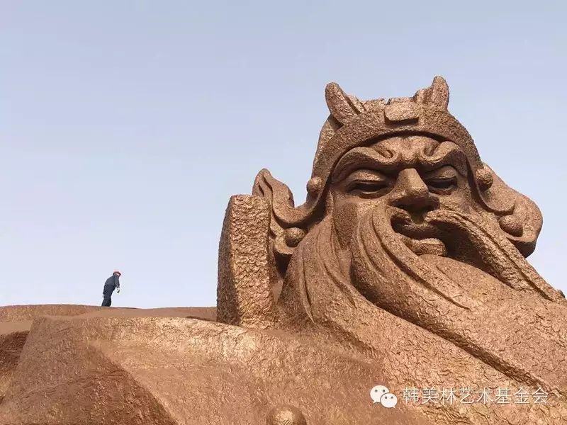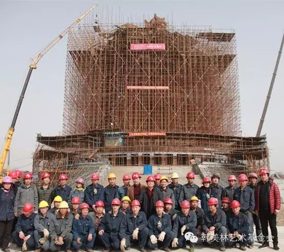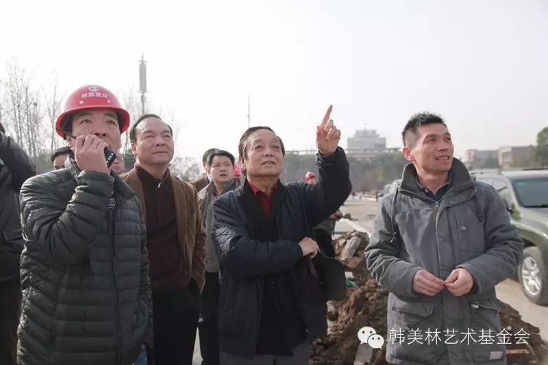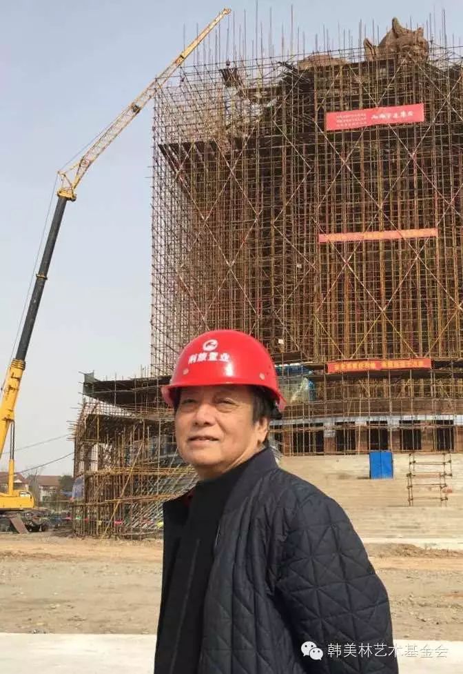 整个景区的施工还在进行,连接各处皆是施工队伍用脚踩出的道路。就在这样一个环境中,韩美林在当地园区建设者的陪同下,从不同角度观察雕塑的制作效果。在雕塑现场,韩美林就雕像的着色工艺和施工的进度安排对雕塑制作人员提出了具体的要求。制作能否达到设计要求,关系到最终作品呈现的效果,关系到整个作品的成败。对此,韩美林“锱铢必较”,绝不容许半点瑕疵。