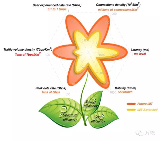 游戏类业务要考虑严苛的时延。物联网业务要考虑大量的低速率终端,对连接数要求很高。不同类型的业务速率要求差别很大,都要考虑。预计5G的应用会更加广泛,所以要考虑覆盖区内提供足够的业务密度。在一些极端的应用场景下,极高的传输速率和极高的用户移动速度(如高铁)也还是有用的。这些要求就构成了小花图中花朵的部分。