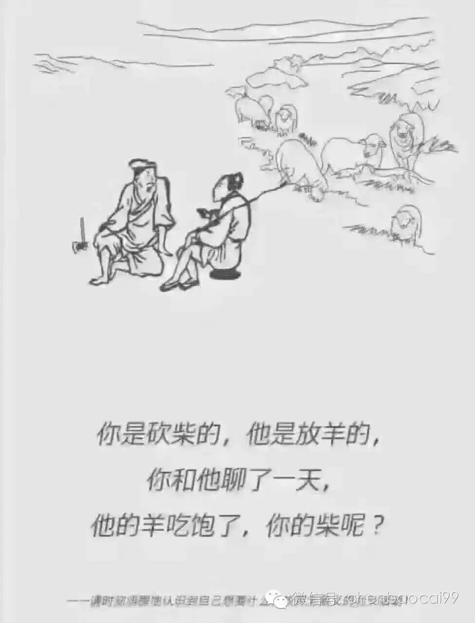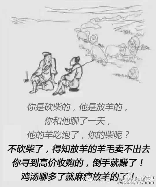 图片一开始的寓意是放弃无用的社交,其实我从来都不赞同放弃无用社交这个说法,因为人生有很多要义,和放羊人聊天,虽然未必能赚到钱,但如果聊得很开心也未尝不可啊。