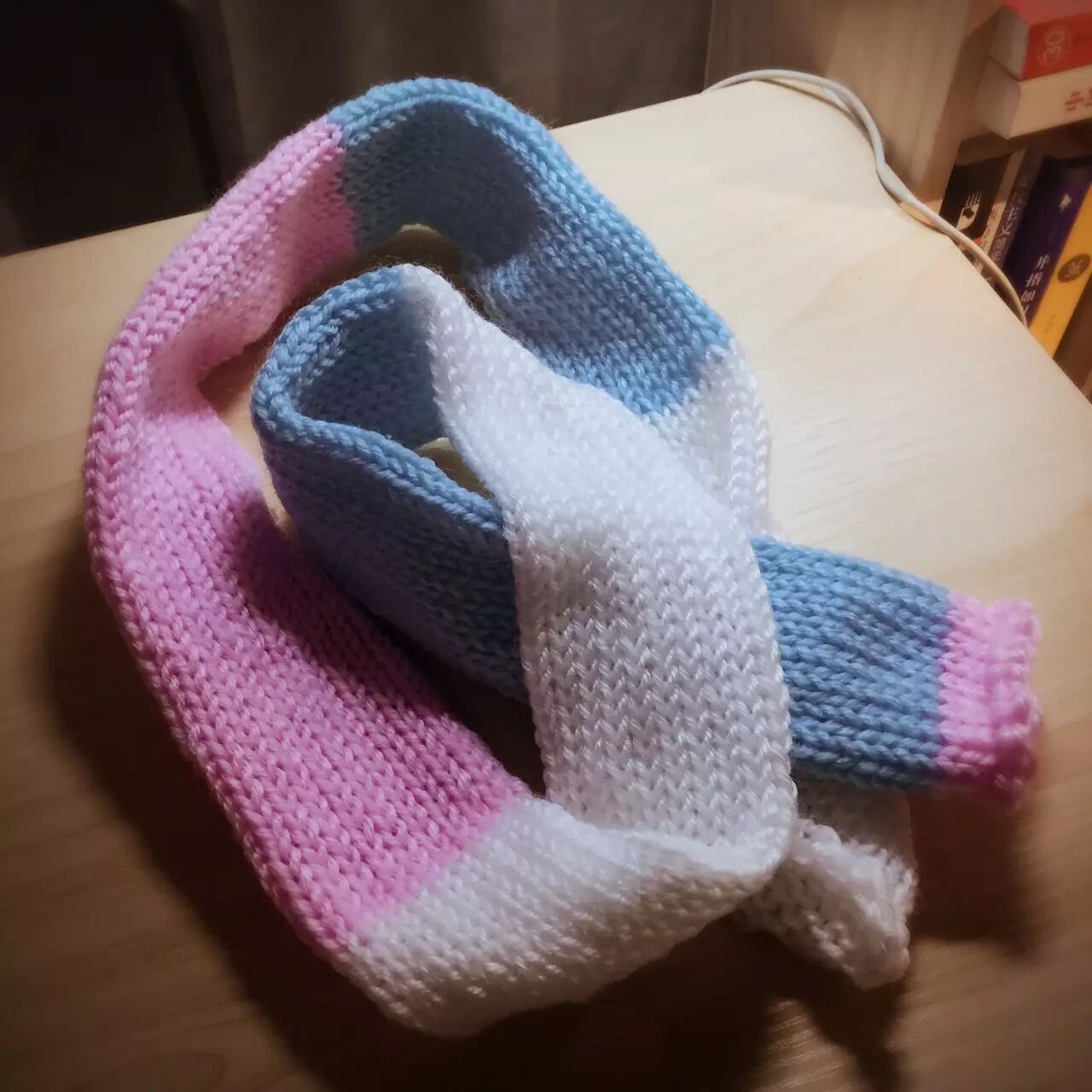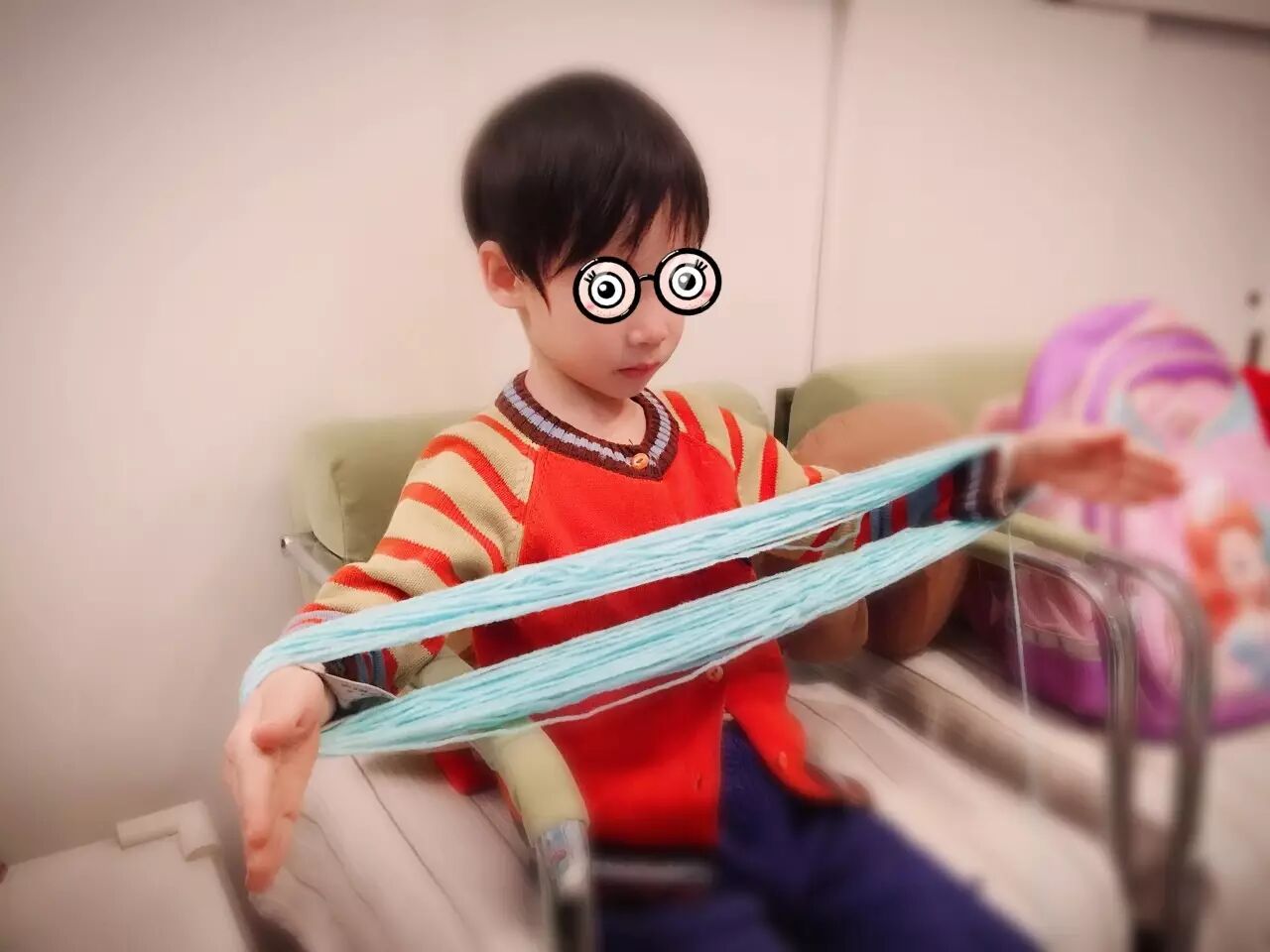 2、和姐姐一起用织毛线机捯饬了一条长度合适但略有遗憾的围巾——原因是我们的叮小朋友摇动手柄太快,所以脱针漏了个大洞哈哈~索性拆了脱针的部分,玩的就是不对称!