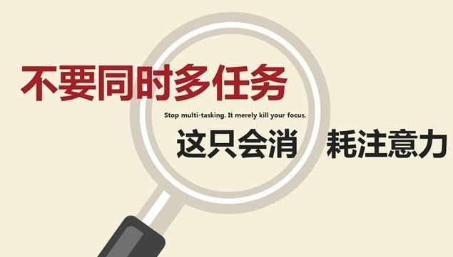大多数人在专注时会把事情完成得更快更好,所以尽量一次只做一件事情。可以设定一段时间,在该段时间内专心做一件事情。在这个过程中,如果大脑中冒出其他未尽事项或一些点子,不妨先写到纸上,继续专注做你手头的事,做完后再找时间处理记录下来的那些事项。
