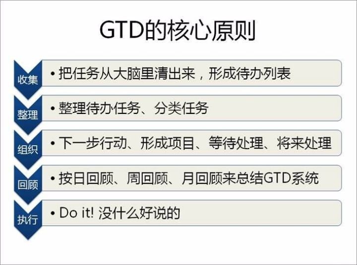管理时间也可以使用一些管理方法,比如,有名的GTD(Getting Things Done)时间管理法: