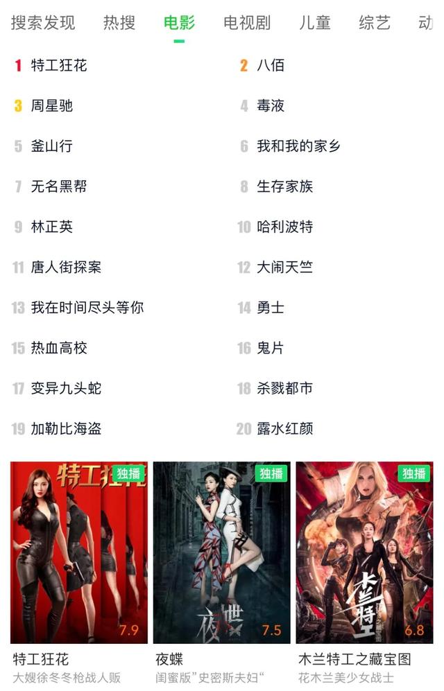 随着最近影院的复工复产,疫情期间网大所吸引的一大批观众再次回到了线下影院,这期间《八佰》的数据占了大多数,网大的关注度和点击率有所下降。在这种情况下,《特工狂花》的数据表现依旧亮眼,点播率持续走高,爱奇艺平台上电影类点播量第一,全平台第四,热搜榜直接飙升至第二,仅次于目前正在大银幕上映的《八佰》。《特工狂花》能有当下的超高热度实属不易,这跟徐冬冬在影片中的精彩演绎也是分不开的。
