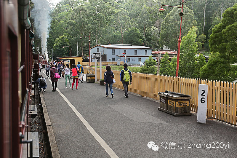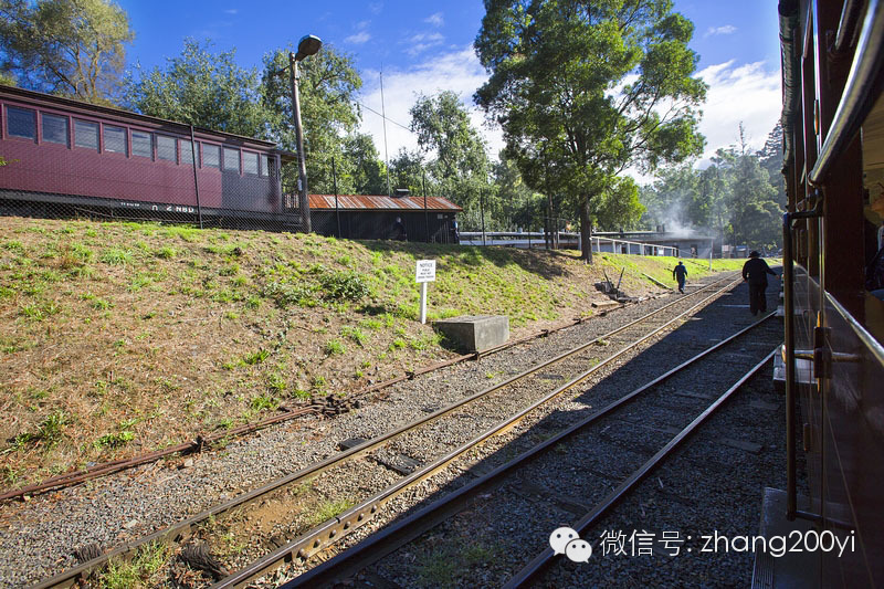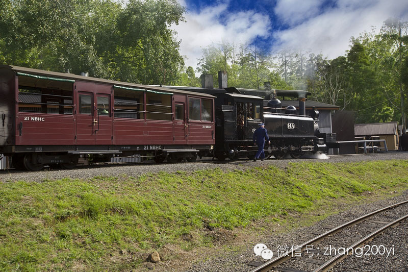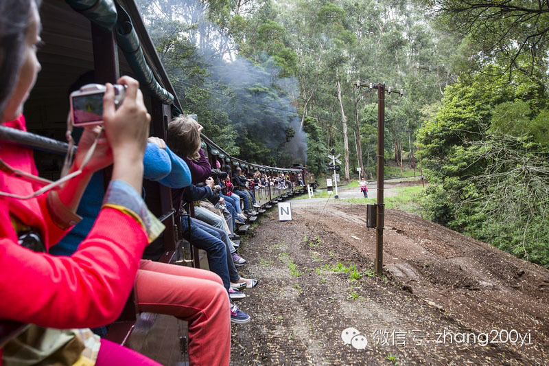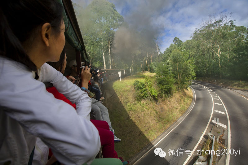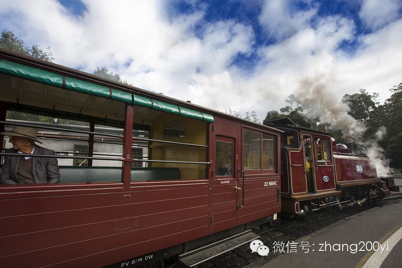 蒸汽火车从单丁农山脚下的Belgrave出发,在单丁农原始森林里转悠,单程大约1个小时。每天上午10点30分第一班出发,火车是烧煤的,蒸汽驱动,白色的蒸汽绕在林梢升腾,很有一番童话的意味。火车转过一个又一个弯道,风景都很优美。