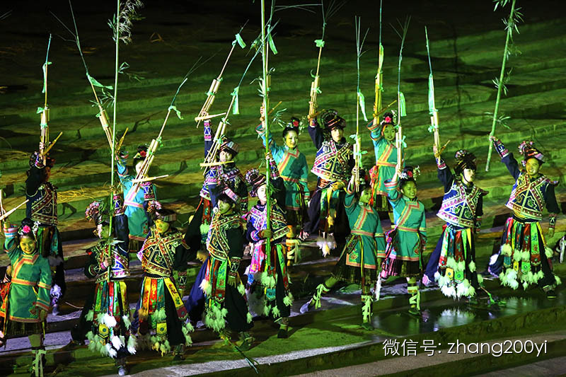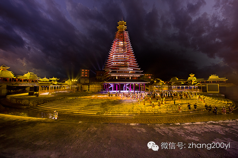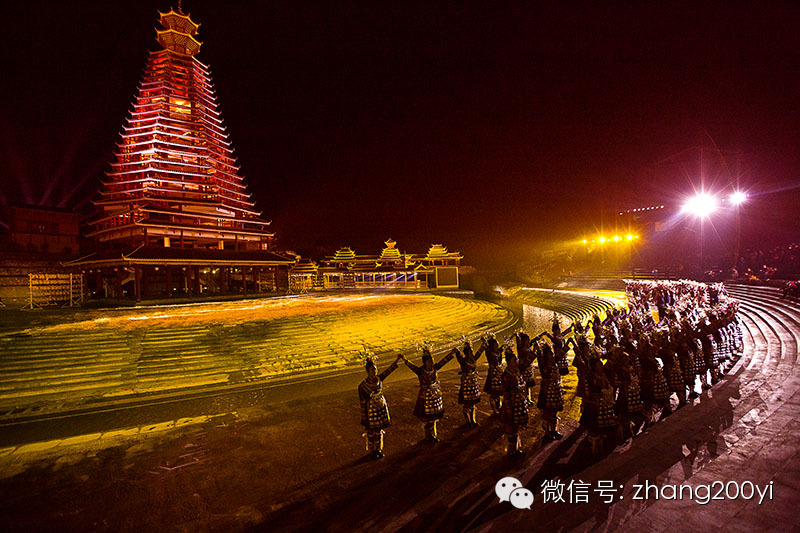 一行人匆匆忙忙欣赏翘街夜景之后,坐车前往黎平城北门薛家坪,观看由张艺谋团队执导策划的《侗族大歌大型实景展演》。整场演出融入行歌坐月、芦笙、敬酒歌等侗族文化元素,侗家妹纸和小伙载歌载舞,演绎侗乡人婚嫁丰收等一幕幕原汁原味生活场景,氛围热烈喜气规模恢弘震人心弦。因场地还在建设中,这场文艺盛宴要在明年5月才公演,我们可先睹为快。