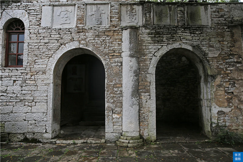 墙体木构,石板青瓦盖顶,构架繁复,雕镂精细;大礼堂前面,左右分别两排教学楼,石墙体,木架构,一楼一底,走廊式,每间教室左右窗户各五共十扇,花窗为冰裂纹样,寓意“十年寒窗”。左排教学楼后面有后花园,右排教学楼后面有小河流,花香袅袅,流水潺潺,妙不可言。
