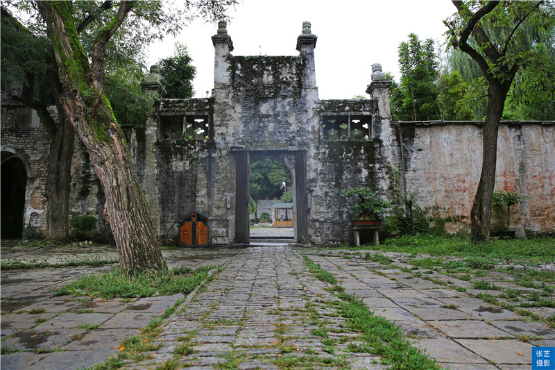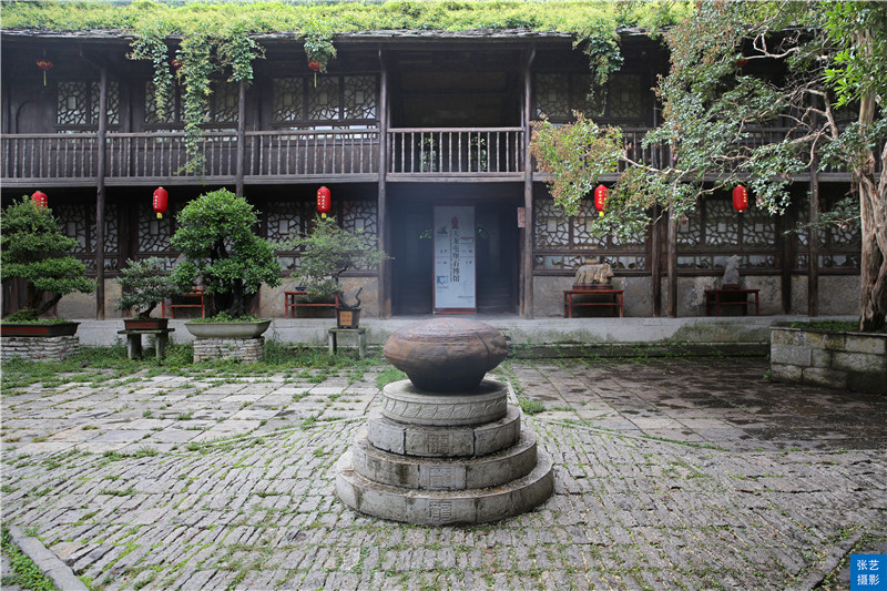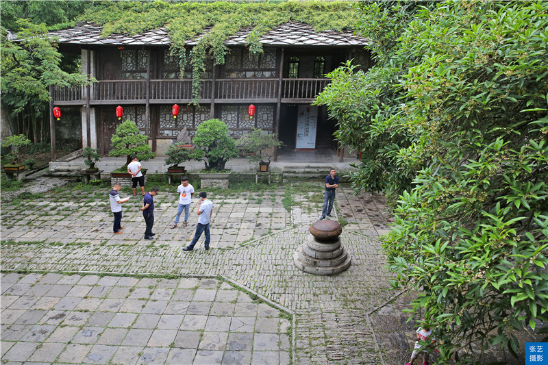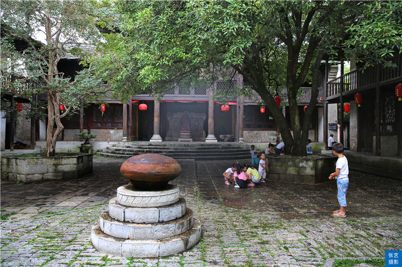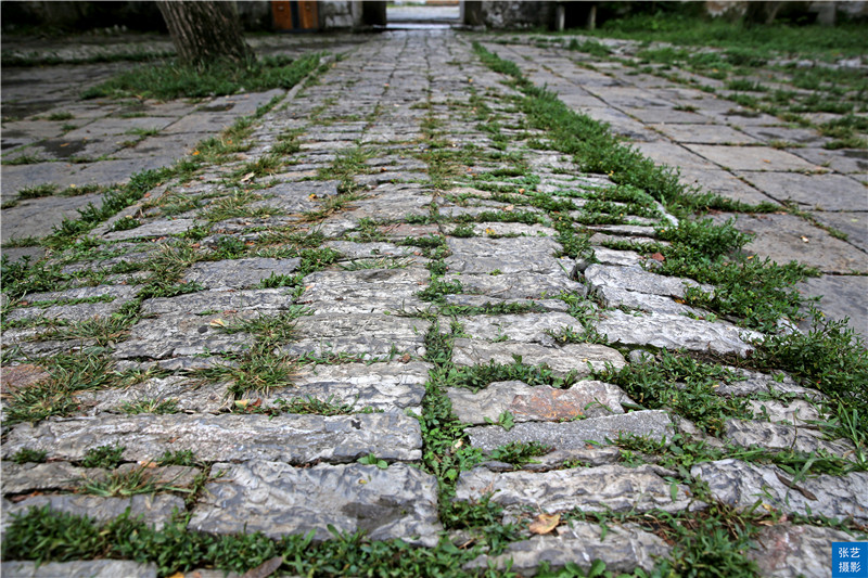 图为庭院都是铺垫的石头,踩了一百年了完好无损,地上用石头铺就了个向外的箭头图案,指向大门,寓意学子们学业有成,走出去闯荡外面的世界。