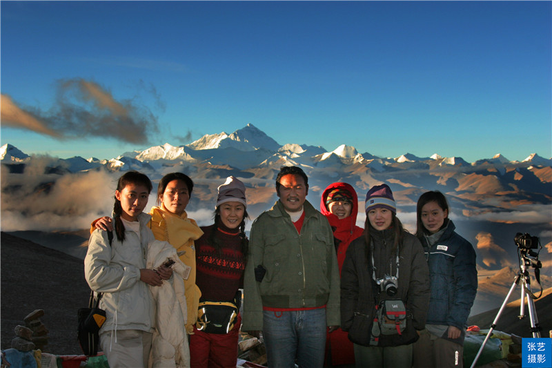 全体女生和司机阿里王(中间)在珠峰前合影。
