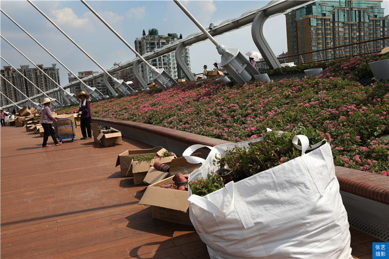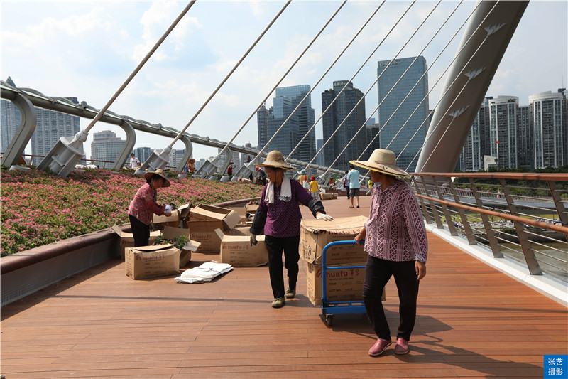 我要为这些城市美容师们点赞,这些花工都是上了年纪的妇女,她们滚烫的桥面上搬运花盆,打理桥上的花基,但是有一些游客在拍照的时候,认为搬运花盆拖着车的花工影响了她们的拍照,对着这些花工就大声嚷嚷:快点走,快点走!不要挡着我们了!其实花工们在炎炎烈日的夏天作业真的挺不容易,希望大家都相互体谅一点吧。