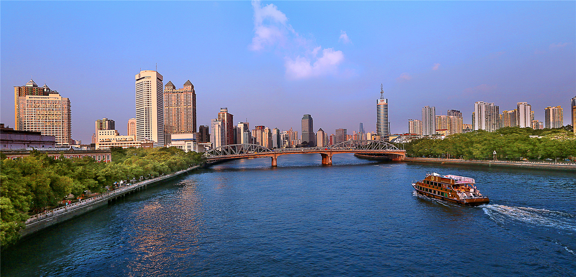 广州连接珠江两岸的桥梁有很多,在珠江上的大桥从东往西共七座,依次为:广州大桥、海印大桥、江湾大桥、海珠桥、解放大桥、人民桥、海珠桥等。珠江两岸现状桥梁均为车行、人行两用桥,人行道偏窄,缺乏公共空间体验性。没有想到这座新建的海心桥作为连接南北两岸的重要交通流线,可满足步行、无障碍与自行车等多种交通需求,沿步道设置连续的遮阳雨篷,可实现全天候,风雨无阻的舒适通行的景观桥,以后广州又多了一项打卡旅游的好去处!