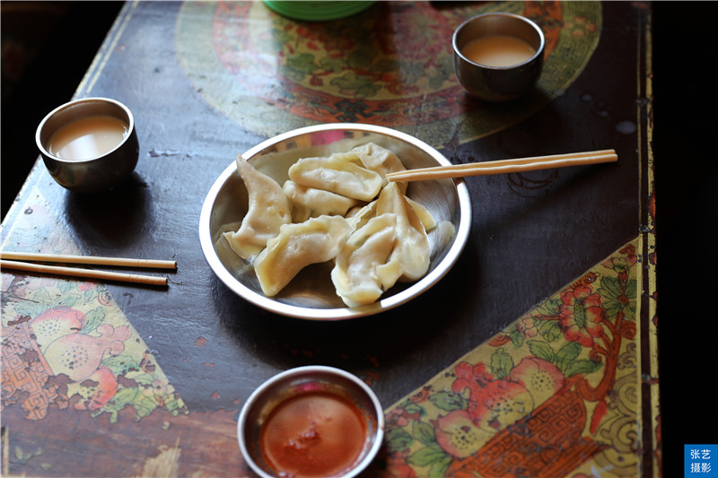 来茶馆的多是当地人,他们每天来这里吃茶比上班还准点,终年无休,尤其是在干燥的冬天,喝甜茶既不烂嘴巴又可以暖身子。常有转经途上的老人在此歇脚,一手握着转经筒,一手捻着佛珠,诵经呡茶两不误。