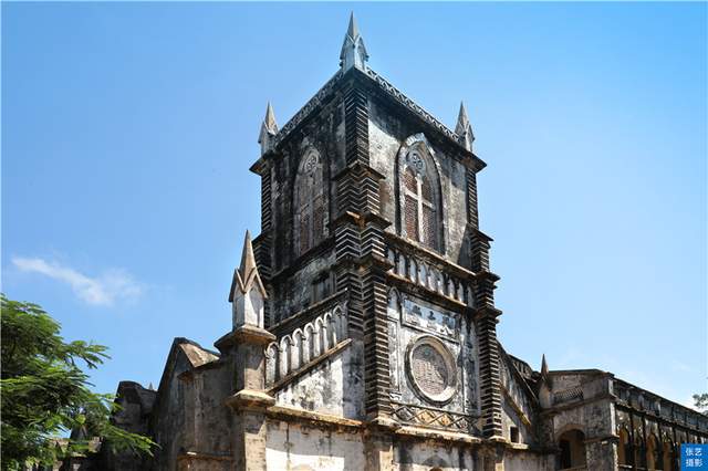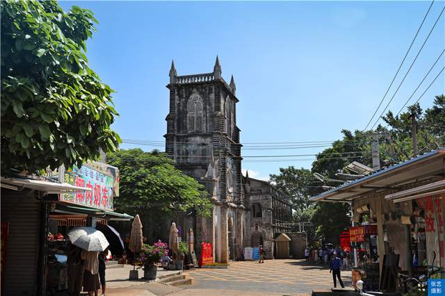 我们登上涠洲岛之后,意想不到的是,远远望去掩映在一片绿影婆娑的芭蕉林和菠萝蜜树林中,竟然有一座是清末“雷廉”地区最为宏伟的教堂,享有东方"巴黎圣母院"美誉的涠洲盛塘天主教堂。