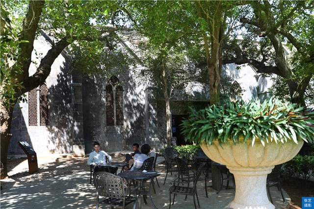 穿过教堂左侧的门,是一处宽阔平整的草坪,绿草如茵,是用来举行宗教活动的,也可以预约举办婚礼。草坪下是花园,园内建有一座精巧的三层石雕莲叶喷水池,潺潺流水自上而下如串串珠链滴落水池,显得雍容典雅,水池两侧还整齐地栽种着数棵高大的棕榈树,很有一种阿拉伯地区的味道。