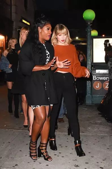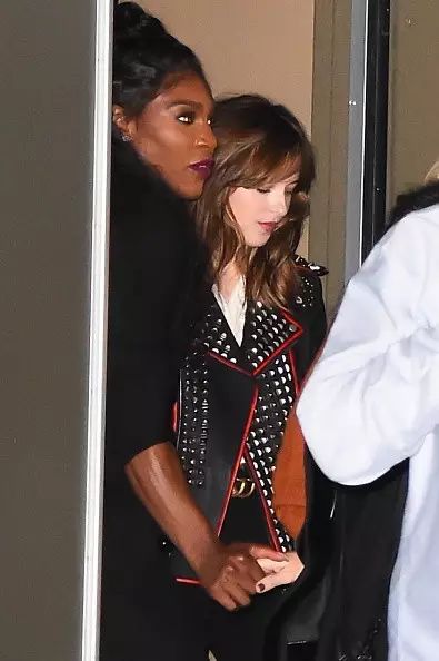 不过,真正让人看得目瞪口呆的还是周四晚,在纽约SOHO的一家夜店门口,塞雷娜又出现在了泰勒·斯威夫特超豪华闺蜜团的阵容中,而且一直与霉霉、超模卡莉·克罗斯以及《五十度灰》女主角达科塔·约翰逊有说有笑。