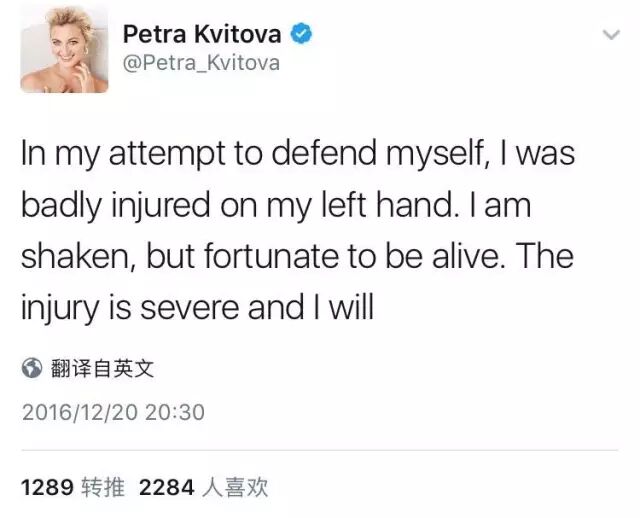 在通过经纪公司发表在Twitter上的声明中,科维托娃表现出了非常坚强和乐观的情绪。“感谢你们今天发来的所有暖心问候,正如你们可能听说了的,我今天在自己的公寓遭到了他人的持刀攻击。在试图自卫时,我的左手严重受伤。现在我仍然感觉后怕,但庆幸的是人还活着。伤势的情况很严重,我需要接受专家的治疗,不过如果你们了解我,我是坚强的,会挺过去。再次感谢你们的爱与支持,现在我希望能有一些隐私,以便专注于在康复上。”