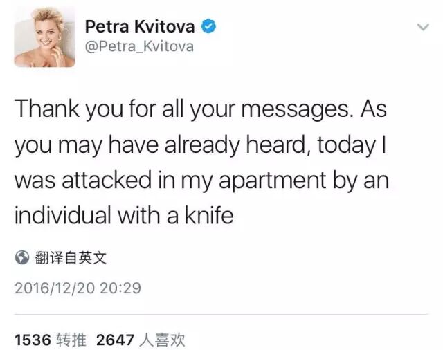 “发生在我身上的事情显然并不令人愉快,但它已经过去了。”科维托娃在捷克联合会杯代表队的脸书网页上如是表示,“现在重要的是得让医生看看我的手臂情况怎么样。我信任他们,相信一切都会变好的,我得到了最好的治疗,并与我所爱的家人们保持着联系。这是我经历过的最糟糕的事情。再次感谢你们惦记着我。不要为我担心!Petra。”