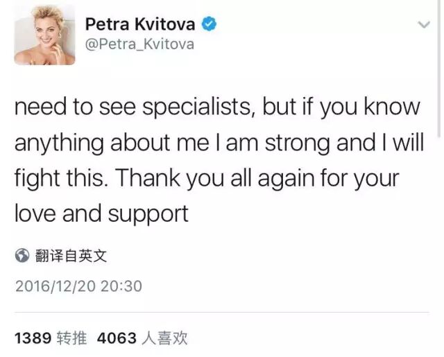 事后据其经纪人凯蒂·斯贝尔曼在Twitter上透露,科维托娃于北京时间今天凌晨接受了长达3小时45分钟的手术治疗,以拯救她可能受到严重危及的职业生涯。