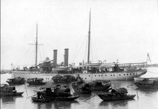 在中国水域活动的卢克斯号炮舰,库尔兹就在它的上面服役,可是照片是否是他照的则没有证据,可以看到周围中国民用的舢板聚集成群。