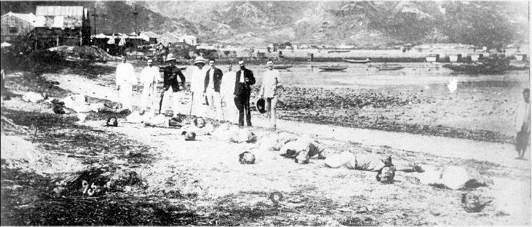 血腥的杀戮场面,义和团民被绑缚即将屠杀,看来,这张照片是在海边的刑场拍摄,推测可能是天津,行刑者则是清朝官府。