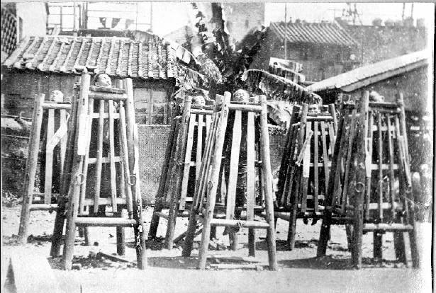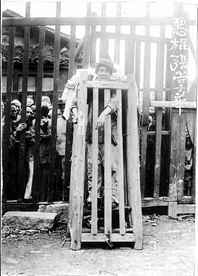 中国官府的惩罚犯人方法 ?C 站笼,摄影者恰好摄下了犯人的名字和罪名,恶棍也算罪名,今天看来让人有些觉得奇怪。