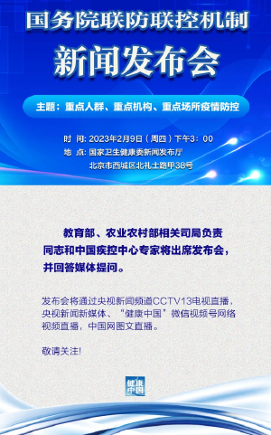 00举行新闻发布会,介绍重点人群、重点机构、重点场所疫情防控有关情况。教育部、农业农村部相关司局负责同志和中国疾控中心专家将出席发布会并回答媒体提问。