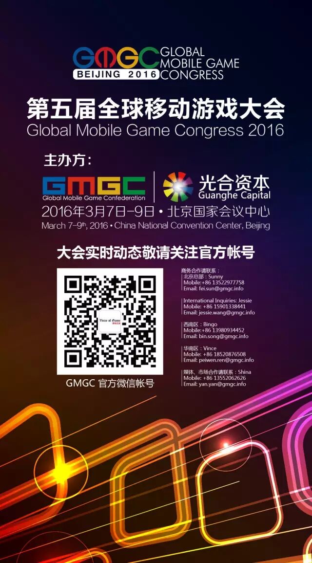 由全球移动游戏联盟GMGC主办的第五届全球移动游戏大会GMGC2016,将于2016年3月7日至9日在国家会议中心CNCC(北京)举办,作为亚太地区最具影响力的游戏行业盛会,本届大会将力邀全球35个国家、200多位业界领袖、3000多个企业、30000多位业界精英参展参会,更有全球超过500个媒体人进行深度报道及现场直播。