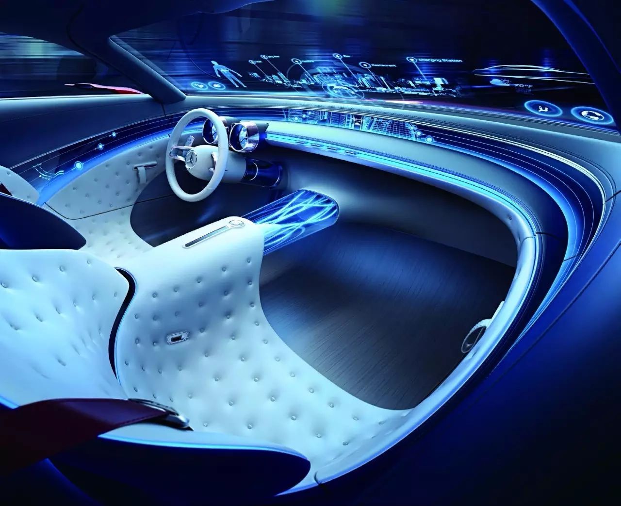 通过鸥翼门进入车内,感觉更像是进入了一个五星级的宇宙飞船,坐在车里的人会被一条星环一样的触摸面板围绕。前风挡玻璃实际上是一个巨大的液晶显示屏,上面可以显示你能想得到的所有信息,这也意味着Vision