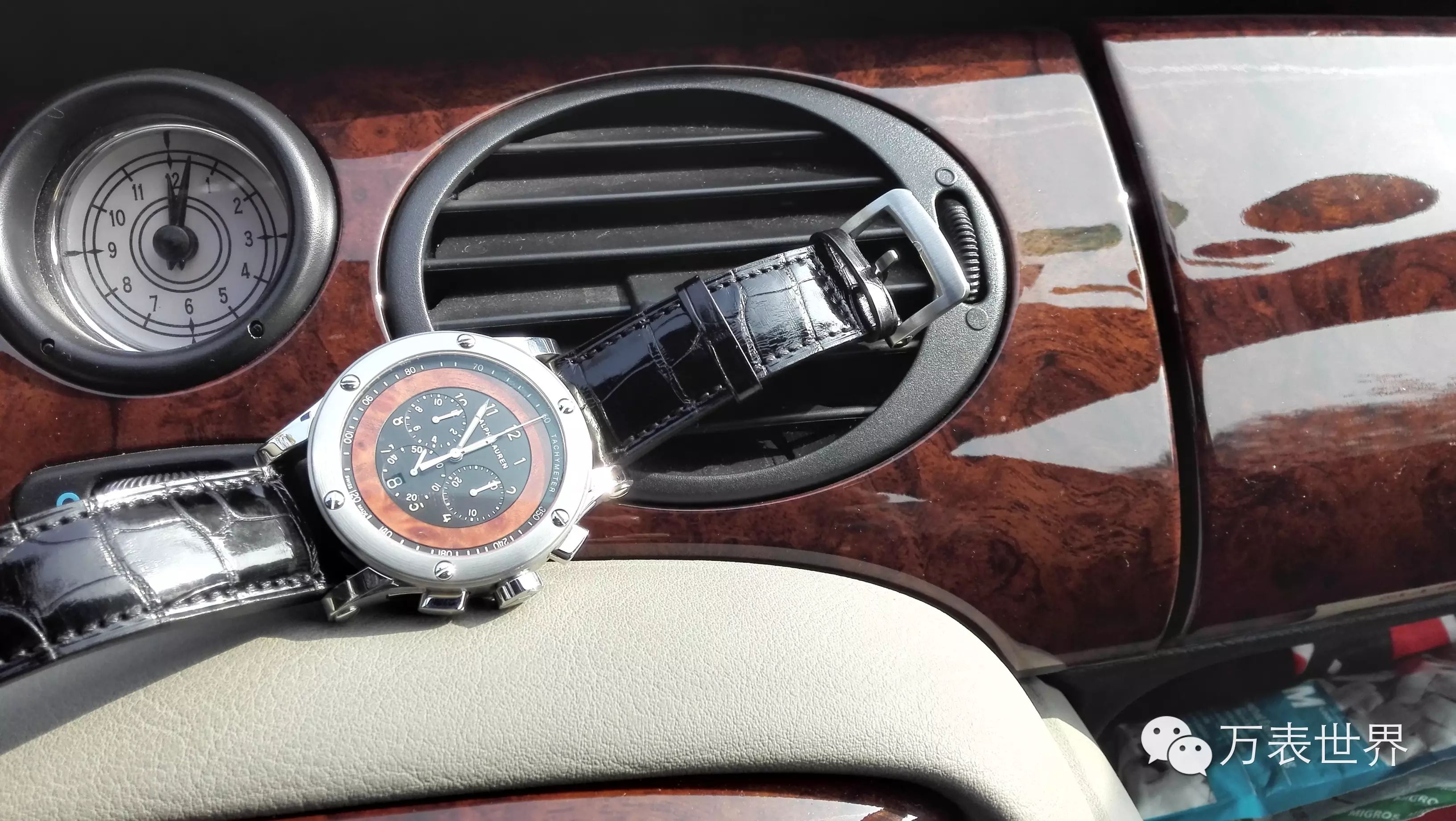 所以,今天上手这款表的机芯和外壳等部件自然来自历峰集团的资源。机芯是积家的计时表机芯。表盘上使用了Ralph Lauren收藏的布加迪古董车上用的那种榆木镶贴。表壳的造型,如果仔细看,也跟古董跑车有着某种联系。同时也有这日内瓦流派特有的一种奢华的美。比如,表壳的纵向表耳间距与表盘尺寸之间的比例接近黄金分割——查阅过大量的这方面数据和爱好者的偏好,我发现这种比例是存在一种黄金率的。这种黄金率,一般在包豪斯风格的手表上是看不到的,因为就手表这种乐适品而言,包豪斯不够阔气!