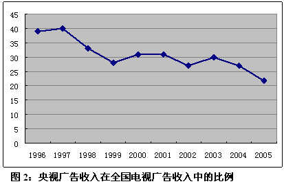 数据统计显示,1997年,省级电视台前10名广告收入总和是31.46亿元,只是中央电视台(41亿元)的0.77倍;2002年,省级电视台前10名广告收入总和74.44亿元,是中央电视台(63.84亿元,不包括独立核算的电影频道,下同)的1.16倍;2003年,省级电视台前10名广告收入总和88.1亿元,是央视(75.3亿元)的1.17倍;2004年,省级电视台前10名广告收入总和96.67亿元,是中央电视台(80.03亿元)的1.2倍;2005年省级电视台前10名广告收入总和122亿元,是中央电视台的1.43倍。