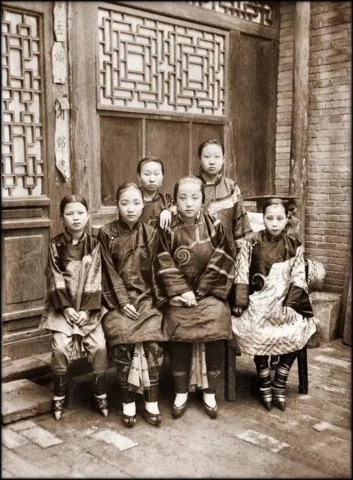 左二的这个女孩子真的非常漂亮,汉族女子裹脚有“三寸金莲”之称,古语“小脚一双,眼泪一缸”,说的就是汉族女子小时候裹脚承受的痛苦。满八旗女子裹脚,称“刀条儿”一般五寸左右,痛苦程度较低,中间两个坐的是满族女孩,两边的是汉人女孩,是丫鬟。