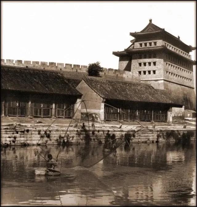 老北京城墙威严壮阔,一男子在护城河上捞鱼。