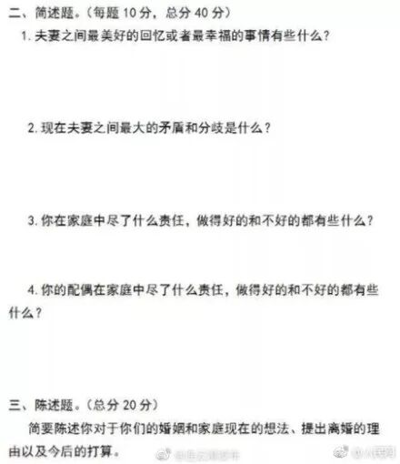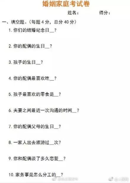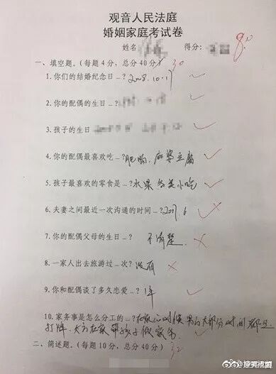 考卷既有“结婚纪念日、家务事如何分工”等客观题,也有“陈述对婚姻和家庭现在的想法”等主观题。
