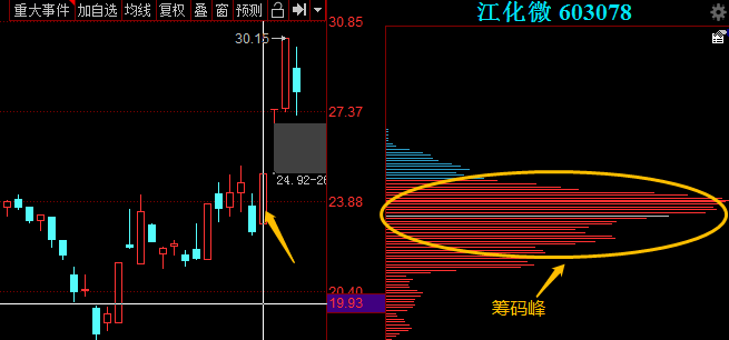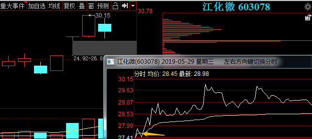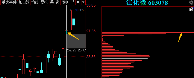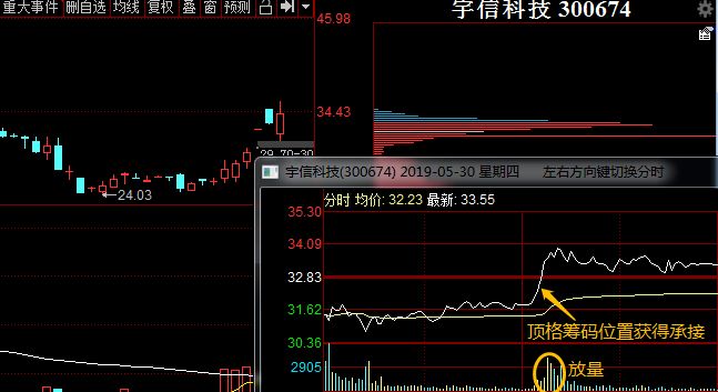 比如,昨天的江天微,分时线破均线(黄色箭头),就是一个不错的介入机会,因为顶格筹码位置是有强承接的。