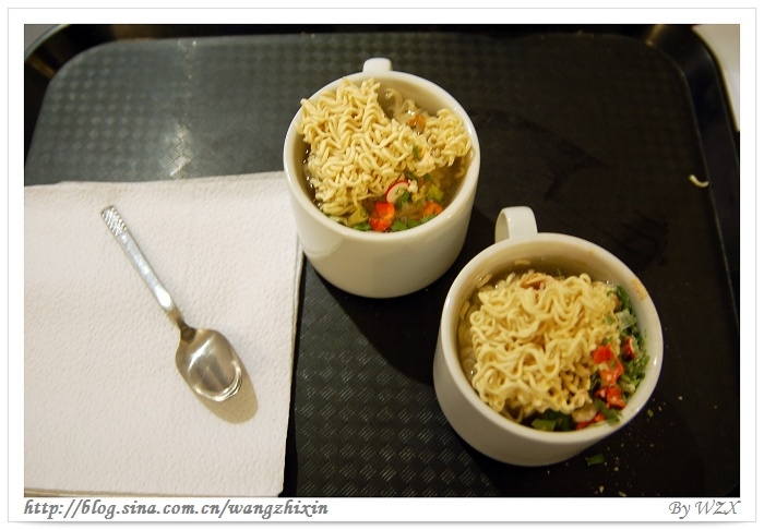 从乌苏怀亚几个小时的飞行回到布宜诺斯,再乘车回到市中心的宾馆,已经是下半夜了……匆促的旅途没有解决温饱问题,于是叫宾馆的服务员帮着给下包方便面吃——因为阿根廷的宾馆里是不供应热水的,所以没有办法自助,并非我扰民。但最后端上来的却是这样两个茶杯里泡得半生不熟的两杯泡面,让人有点哭笑不得,但也要打发一下肚子然后好好和床亲热下了……