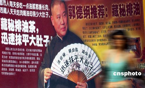 以天价代言减肥茶的郭德纲就被较真的消费者以“广告夸大其词”为由,告上了法庭。直至今日,郭德纲的半身形象配以“迅速抹平大肚子”广告语的该广告赫然印在很多公交车身和广告牌上。然而,消费者投诉,此产品竟是在有关部门查不到广告批号和卫生许可证的“黑户”。