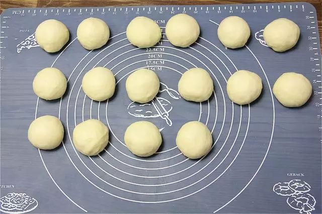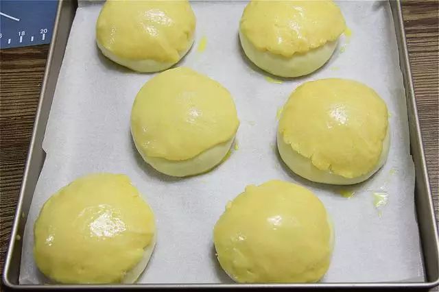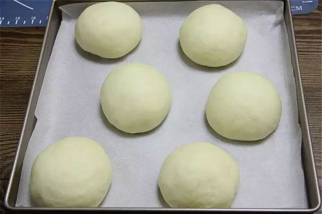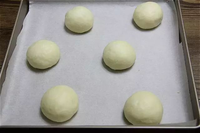 6.20分钟后,面团再次滚圆整形,放在烤盘上。每个之间都要留出足够的空隙。放入发酵箱或者烤箱内进行二次发酵。约50分钟。