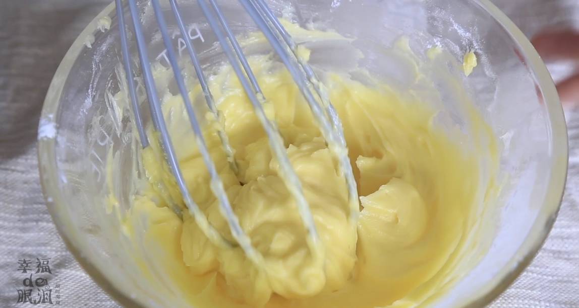 18、分次加入全蛋液,每加一次都要搅拌均匀后再加入下一次,不要一次性全部加入,以免油水分离。鸡蛋要用室温蛋,也会防止油水分离。如果发生油水分离也不要紧,把盆放在热水上几秒钟,看到最外圈的黄油融化了,赶快从热水上拿出来,用打蛋器搅拌,重复这个动作,直至黄油顺滑为止。