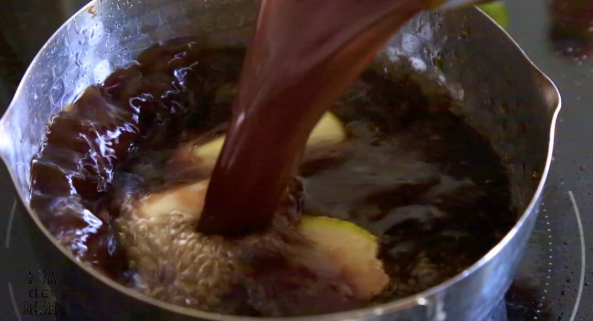 5、把刚刚拌匀的那一杯酱油蚝油混合物倒进去煮开。