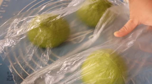 4、面团发酵好以后轻拍面团排气,再把四边都折叠,然后翻过来称一下总重量,再平均分成三份。滚圆,盖上保鲜膜松弛20分钟。