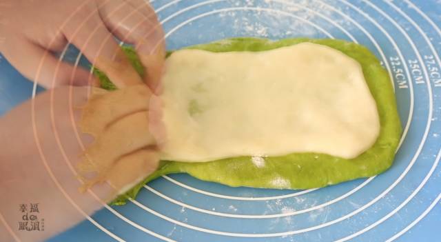 6、把麻薯放上去,注意底边部分留出一些空间不要放。不然最后卷的时候馅就会露出来了,这都是我失败的经验。呵呵