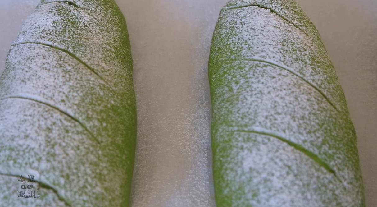 12、然后在面团表面筛一些高筋面粉。用刀子在面包表面划口,个人觉得划斜口好看。