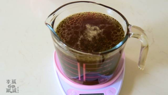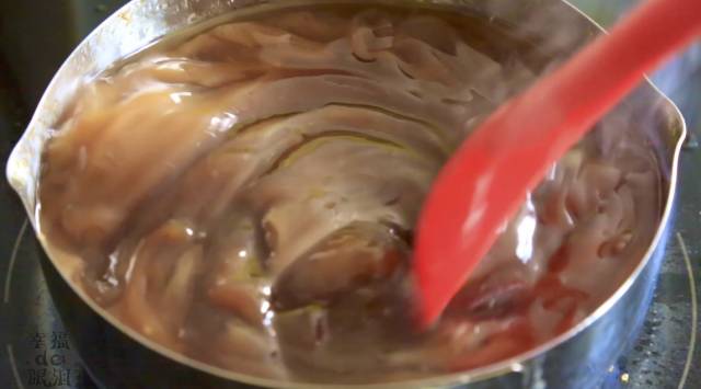 6、开锅以后把葱姜捞出来,再倒入淀粉水,然后用勺子搅拌均匀。煮至开锅冒泡即可关火,放在一旁晾凉备用。叉烧包芡汁就做好了。
