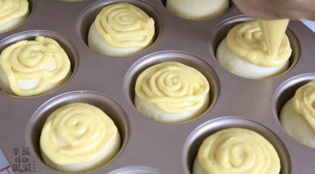 20、面团发酵至原来的两倍大,取出来,先预热烤箱上下火180度10—15分钟。然后把酥皮面糊挤在表面。
