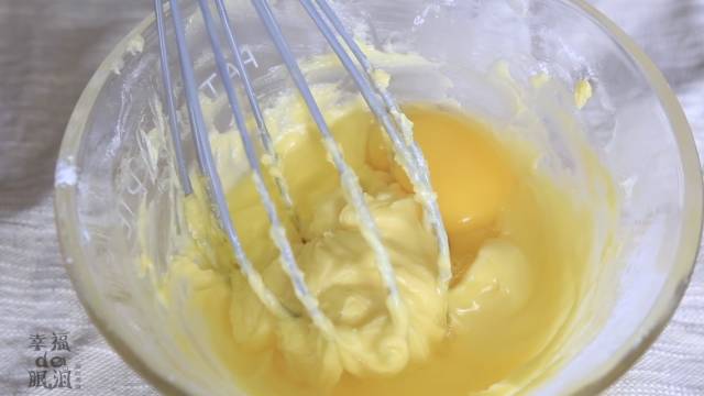 18、分次加入全蛋液,每加一次都要搅拌均匀后再加入下一次,不要一次性全部加入,以免油水分离。鸡蛋要用室温蛋,也会防止油水分离。如果发生油水分离也不要紧,把盆放在热水上几秒钟,看到最外圈的黄油融化了,赶快从热水上拿出来,用打蛋器搅拌,重复这个动作,直至黄油顺滑为止。