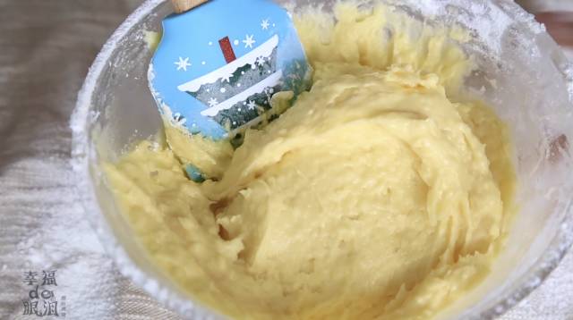 19、然后筛入低筋面粉,搅拌至看不到干粉就可以了。把酥皮面糊装进裱花袋备用。