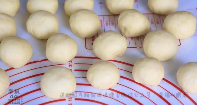 13、分割成23克/个的小面团,然后滚圆盖上保鲜膜松弛20分钟。